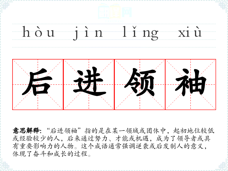 “后进领袖”指的是在某一领域或团体中,起初地位较低或经验较少的人,后来通过努力、才能或机遇,成为了领导者或具有重要影响力的人物。这个成语通常强调逆袭或后发制人的意义,体现了奋斗和成长的过程。