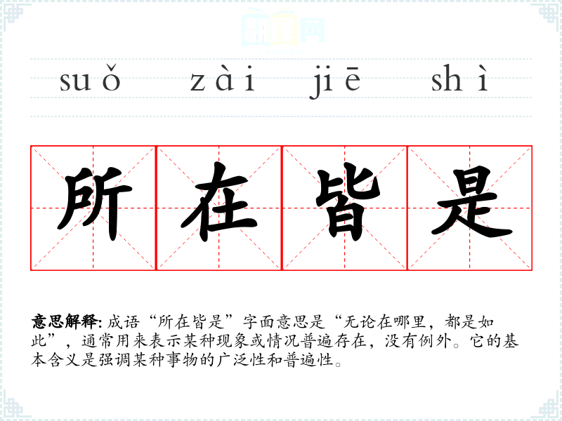 成语“所在皆是”字面意思是“无论在哪里,都是如此”,通常用来表示某种现象或情况普遍存在,没有例外。它的基本含义是强调某种事物的广泛性和普遍性。