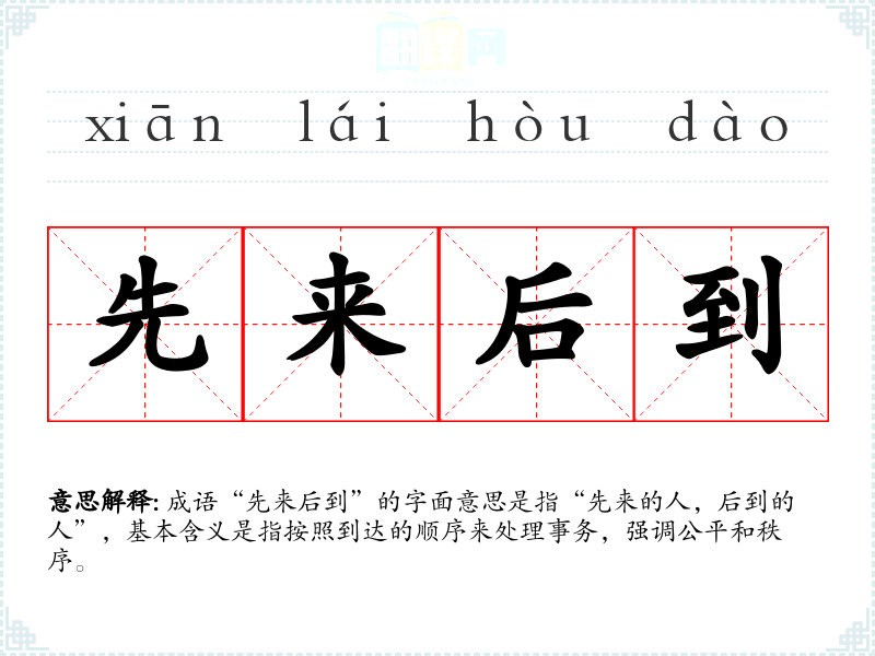成语“先来后到”的字面意思是指“先来的人,后到的人”,基本含义是指按照到达的顺序来处理事务,强调公平和秩序。