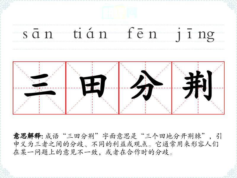在现代社会,尤其是在团队合作、企业管理和社会治理中,“三田分荆”反映了人际关系的复杂性和利益的多样性。它提醒人们在面对分歧时,要学会沟通和妥协,以达到共同目标。