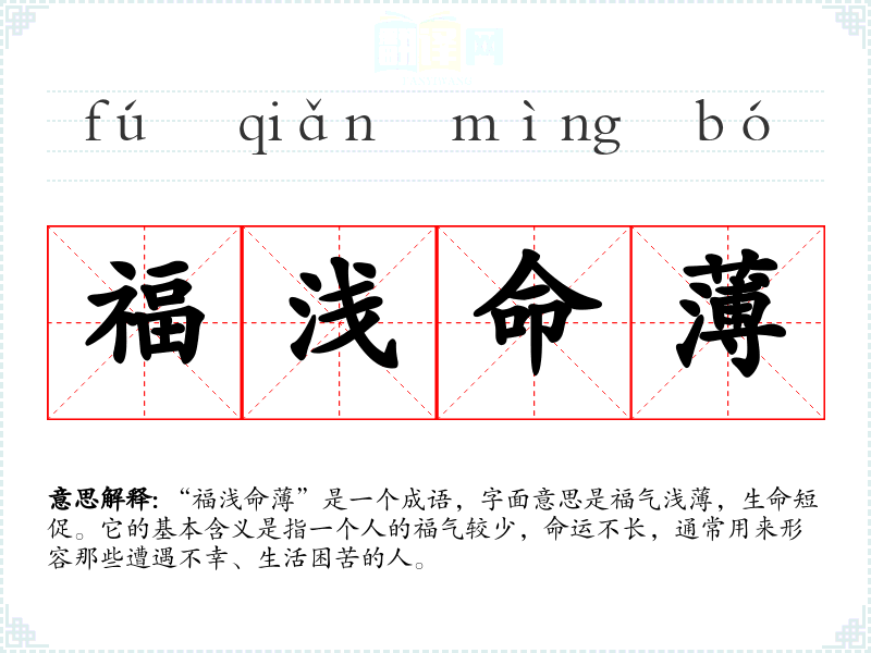 “福浅命”是一个成语,字面意思是福气浅,生命短促。它的基本含义是指一个人的福气较少,命运不长,通常用来形容那些遭遇不幸、生活困苦的人。