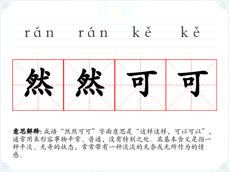 成语“然然可可”字面意思是“这样这样,可以可以”,通常用来形容事物平常、普通,没有特别之处。其基本含义是指一种平淡、无奇的状态,常常带有一种淡淡的无奈或无所作为的情感。