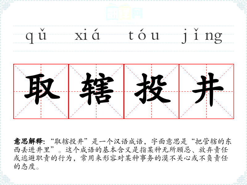 “取辖投井”是一个汉语成语,字面意思是“把管辖的东西丢进井里”。这个成语的基本含义是指某种无所顾忌、放弃责任或逃避职责的行为,常用来形容对某种事务的漠不关心或不负责任的态度。