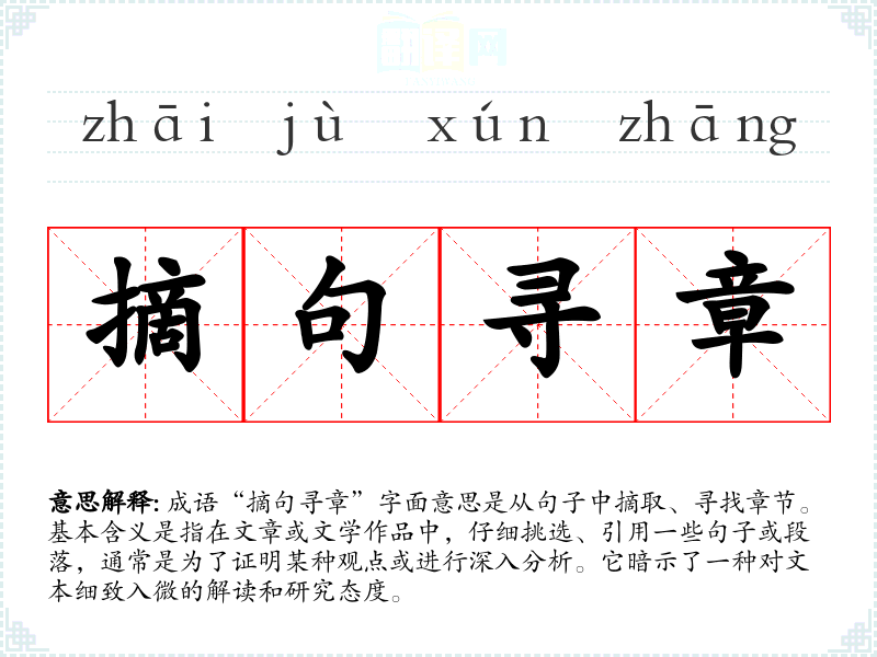 成语“摘句寻章”字面意思是从句子中摘取、寻找章节。基本含义是指在文章或文学作品中,仔细挑选、引用一些句子或段落,通常是为了证明某种观点或进行深入分析。它暗示了一种对文本细致入微的解读和研究态度。