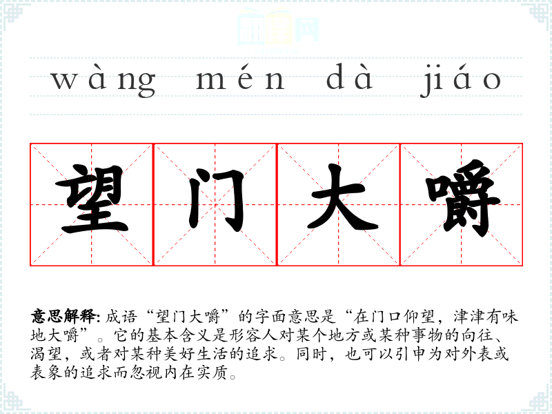 成语“望门大嚼”的字面意思是“在门口仰望,津津有味地大嚼”。它的基本含义是形容人对某个地方或某种事物的向往、渴望,或者对某种美好生活的追求。同时,也可以引申为对外表或表象的追求而忽视内在实质。