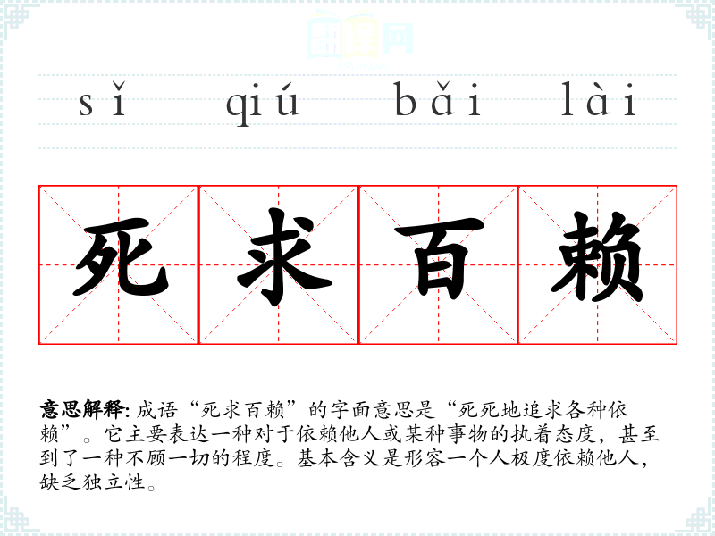 “死求百赖”并没有确切的历史典故或文学出处,可以视为现代汉语中的一种常见表达方式。它可能源于对“死心塌地”或“百般依赖”等成语的变形和组合,反映了社会中对依赖行为的批判。