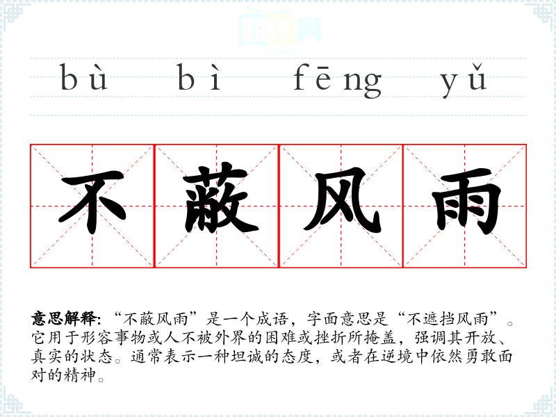 “不蔽风雨”是一个成语,字面意思是“不遮挡风雨”。它用于形容事物或人不被外界的困难或挫折所掩盖,强调其开放、真实的状态。通常表示一种坦诚的态度,或者在逆境中依然勇敢面对的精神。