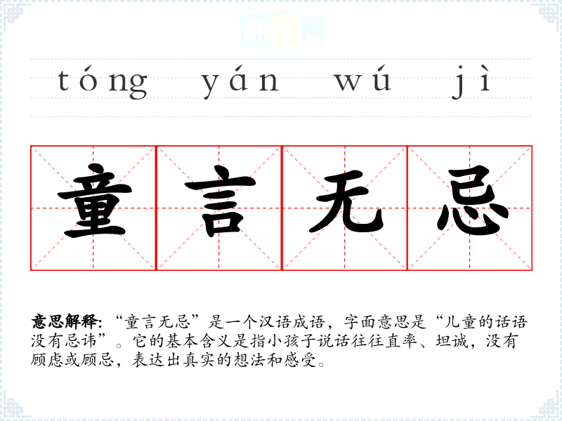“童言无忌”是一个汉语成语,字面意思是“儿童的话语没有忌讳”。它的基本含义是指小孩子说话往往直率、坦诚,没有顾虑或顾忌,表达出真实的想法和感受。