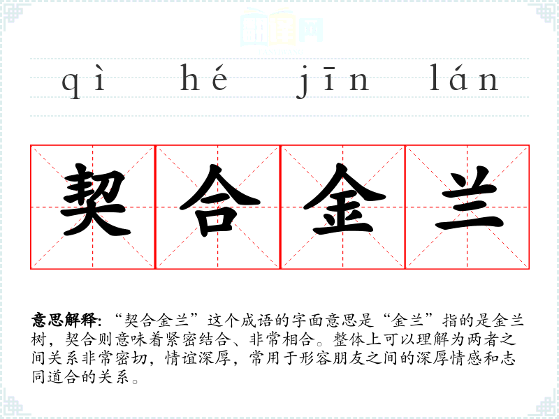 | 契合金兰 | 契合:投合;金兰:指朋友。比喻朋友交情深厚。 |