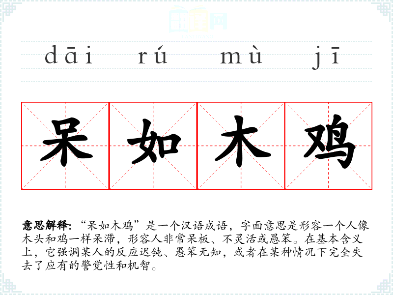 “呆如木鸡”是一个汉语成语,字面意思是形容一个人像木头和鸡一样呆滞,形容人非常呆板、不灵活或愚笨。在基本含义上,它强调某人的反应迟钝、愚笨无知,或者在某种情况下完全失去了应有的警觉性和机智。