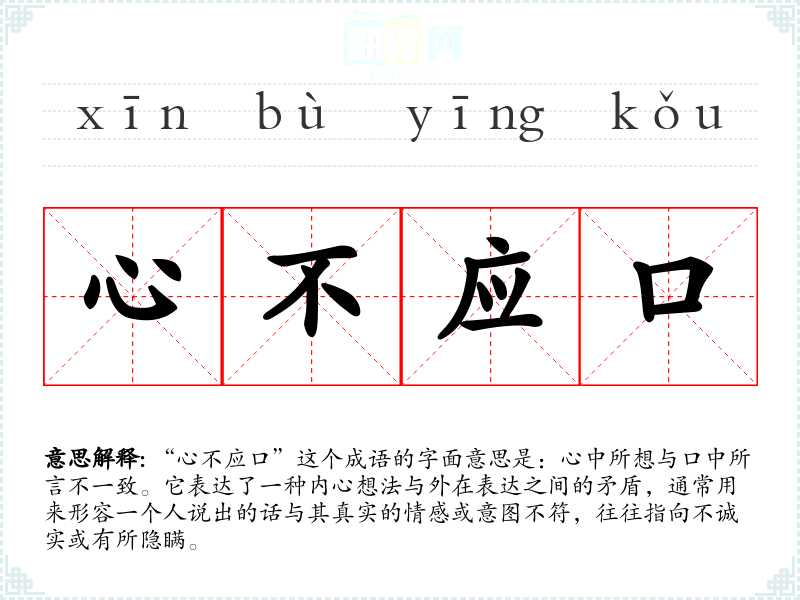 “心不应口”这个成语的字面意思是:心中所想与口中所言不一致。它表达了一种内心想法与外在表达之间的矛盾,通常用来形容一个人说出的话与其真实的情感或意图不符,往往指向不诚实或有所隐瞒。