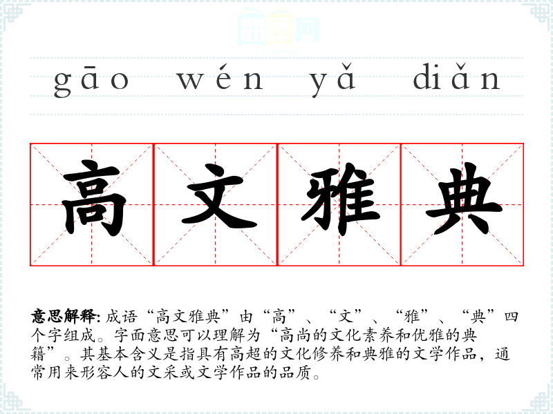 “高文雅典”并没有明确的历史典故来源,但可以推测其形成与**传统文化中对文人雅士的崇尚有关。在古代,文人被视为社会的中坚,拥有高尚的情操和丰富的知识,常常以“文雅”、“典雅”来形容他们的作品和气质。
