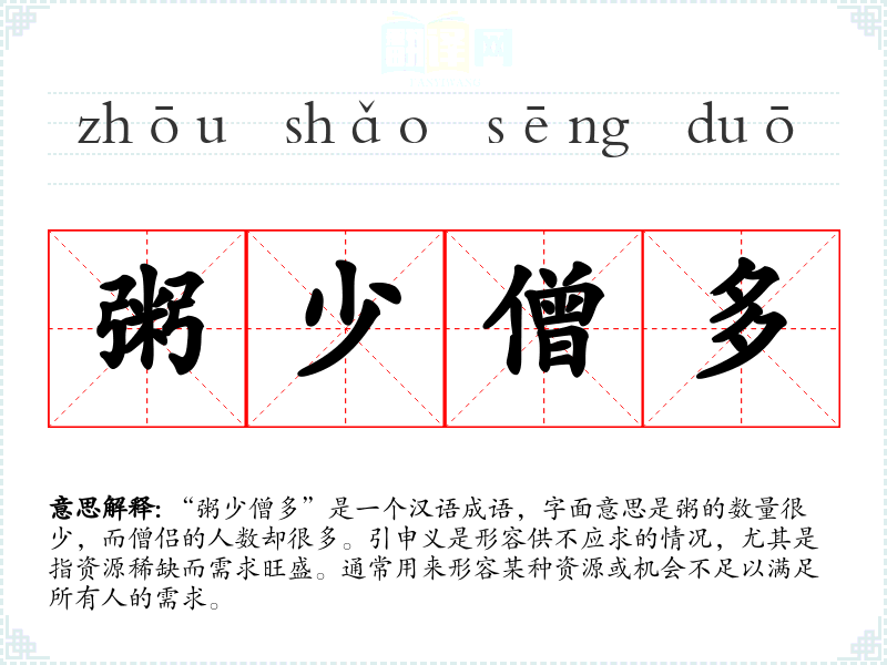 “粥少僧多”是一个汉语成语,字面意思是粥的数量很少,而僧侣的人数却很多。引申义是形容供不应求的情况,尤其是指资源稀缺而需求旺盛。通常用来形容某种资源或机会不足以满足所有人的需求。
