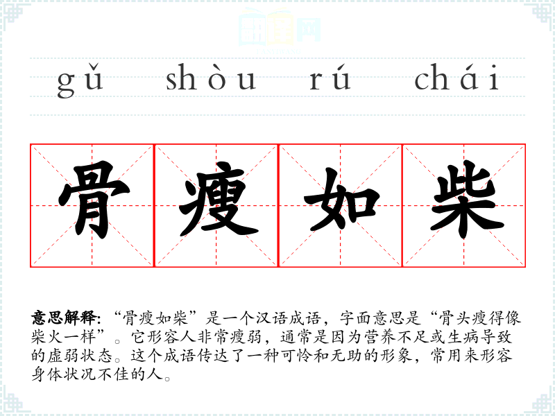 “骨瘦如柴”是一个汉语成语,字面意思是“骨头瘦得像柴火一样”。它形容人非常瘦弱,通常是因为营养不足或生病导致的虚弱状态。这个成语传达了一种可怜和无助的形象,常用来形容身体状况不佳的人。