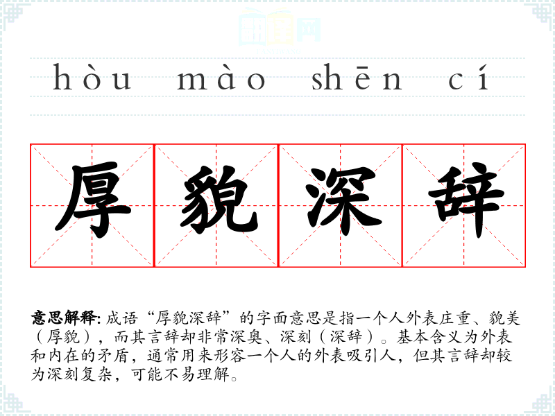成语“厚貌深辞”的字面意思是指一个人外表庄重、貌美(厚貌),而其言辞却非常深奥、深刻(深辞)。基本含义为外表和内在的矛盾,通常用来形容一个人的外表吸引人,但其言辞却较为深刻复杂,可能不易理解。
