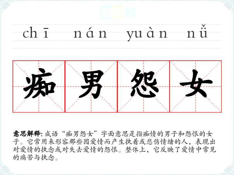 | 痴男怨女 | 旧指爱恋极深但感情上得不到满足的男女。 |