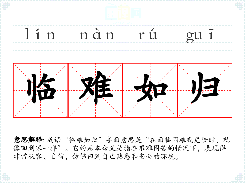 成语“临难如归”字面意思是“在面临困难或危险时,就像回到家一样”。它的基本含义是指在艰难困苦的情况下,表现得非常从容、自信,仿佛回到自己熟悉和安全的环境。