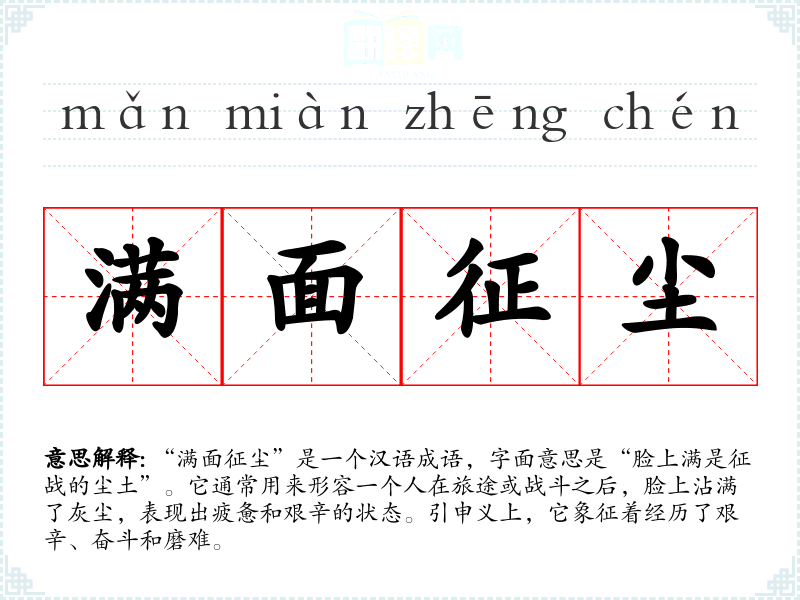 “满面征尘”是一个汉语成语,字面意思是“脸上满是征战的尘土”。它通常用来形容一个人在旅途或战斗之后,脸上沾满了灰尘,表现出疲惫和艰辛的状态。引申义上,它象征着经历了艰辛、奋斗和磨难。