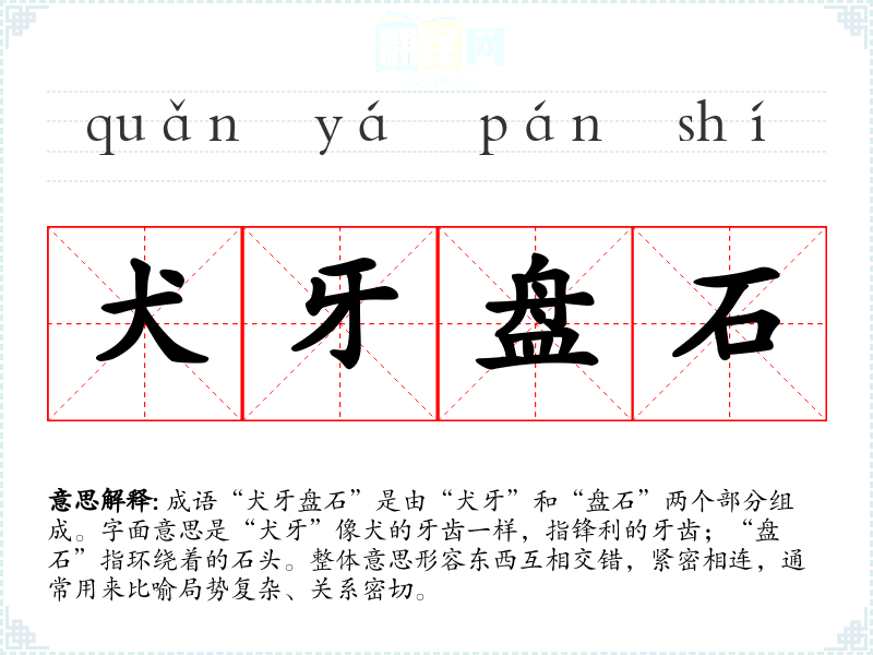 成语“犬牙盘石”是由“犬牙”和“盘石”两个部分组成。字面意思是“犬牙”像犬的牙齿一样,指锋利的牙齿;“盘石”指环绕着的石头。整体意思形容东西互相交错,紧密相连,通常用来比喻局势复杂、关系密切。