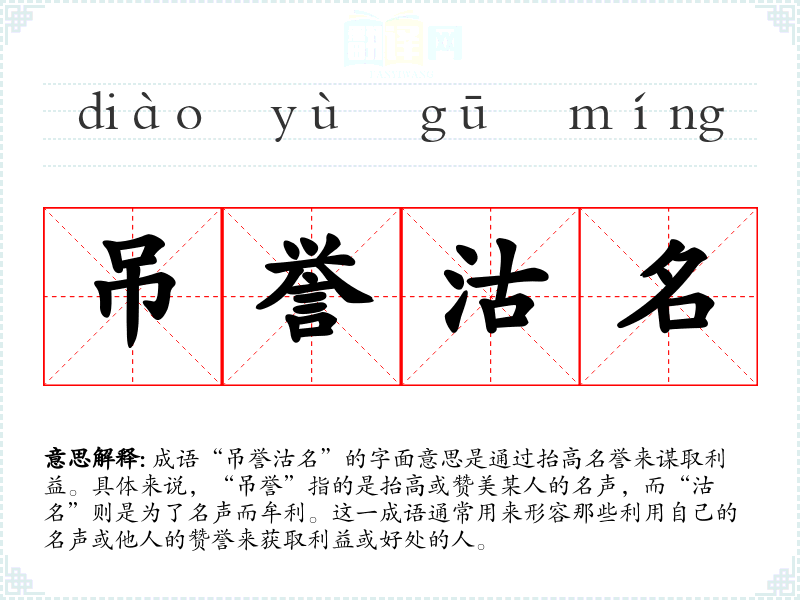 成语“吊誉沽名”的字面意思是通过抬高名誉来谋取利益。具体来说,“吊誉”指的是抬高或赞美某人的名声,而“沽名”则是为了名声而牟利。这一成语通常用来形容那些利用自己的名声或他人的赞誉来获取利益或好处的人。
