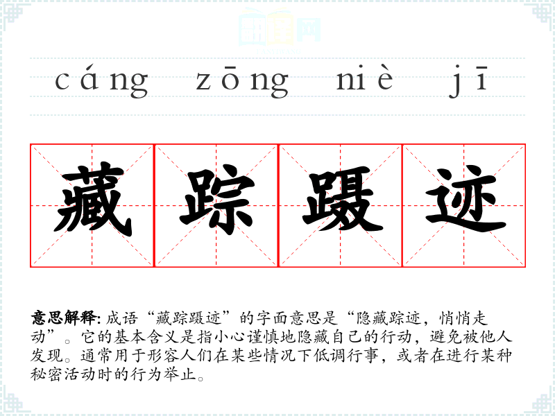成语“藏踪蹑迹”的字面意思是“隐藏踪迹,悄悄走动”。它的基本含义是指小心谨慎地隐藏自己的行动,避免被他人发现。通常用于形容人们在某些情况下低调行事,或者在进行某种秘密活动时的行为举止。