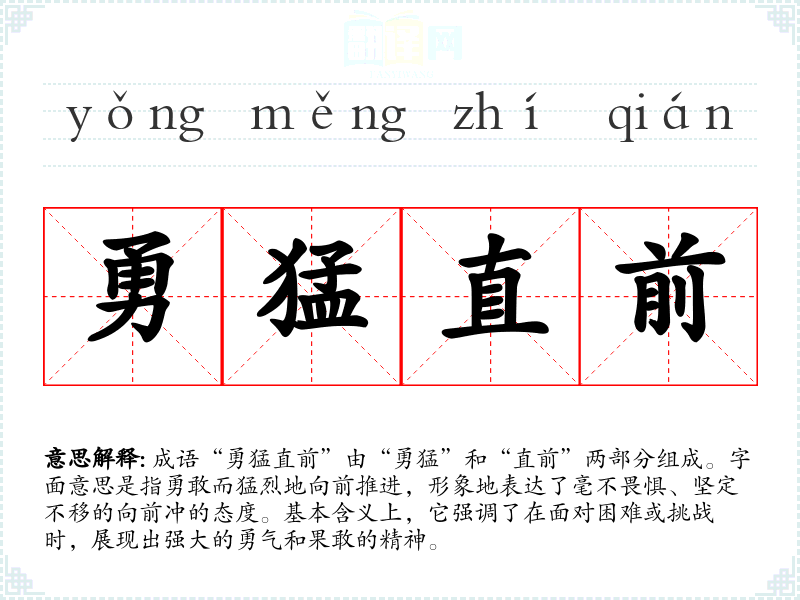 “勇猛直前”并没有具体的历史典故,但其构成的词汇在古代文学中经常出现,表现出一种英雄气概和进取精神。在许多古代文献、诗词中,类似的表达常用于形容将士在战场上不畏艰险、奋勇作战的精神状态。
