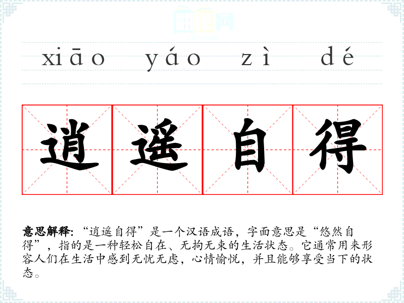 “逍遥自得”是一个汉语成语,字面意思是“悠然自得”,指的是一种轻松自在、无拘无束的生活状态。它通常用来形容人们在生活中感到无忧无虑,心情愉悦,并且能够享受当下的状态。