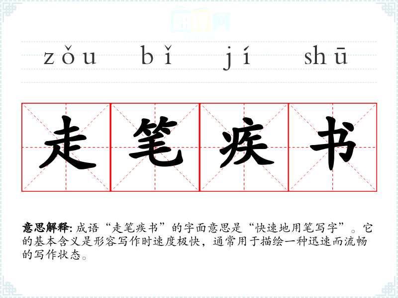 成语“走笔疾书”的字面意思是“快速地用笔写字”。它的基本含义是形容写作时速度极快,通常用于描绘一种迅速而流畅的写作状态。