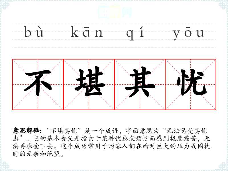 “不堪其忧”是一个成语,字面意思为“无法忍受其忧虑”。它的基本含义是指由于某种忧虑或烦恼而感到极度痛苦,无法再承受下去。这个成语常用于形容人们在面对巨大的压力或困扰时的无奈和绝望。