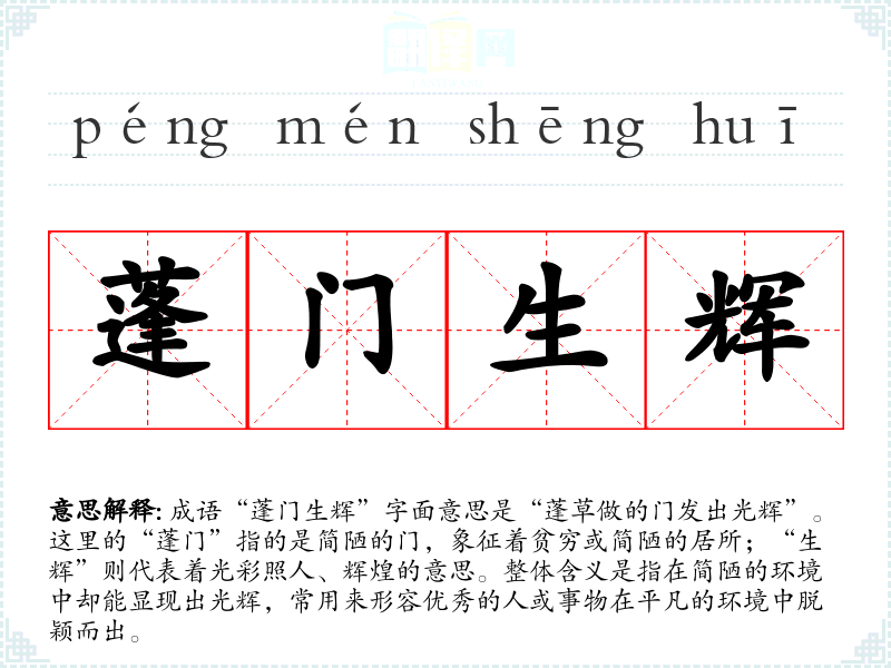 成语“蓬门生辉”字面意思是“蓬草做的门发出光辉”。这里的“蓬门”指的是简陋的门,象征着贫穷或简陋的居所;“生辉”则代表着光彩照人、辉煌的意思。整体含义是指在简陋的环境中却能显现出光辉,常用来形容优秀的人或事物在平凡的环境中脱颖而出。