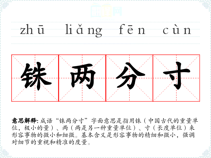 成语“铢两分寸”字面意思是指用铢(**古代的重量单位,极小的量)、两(两是另一种重量单位)、寸(长度单位)来形容事物的微小和细微。基本含义是形容事物的精细和微小,强调对细节的重视和精准的度量。