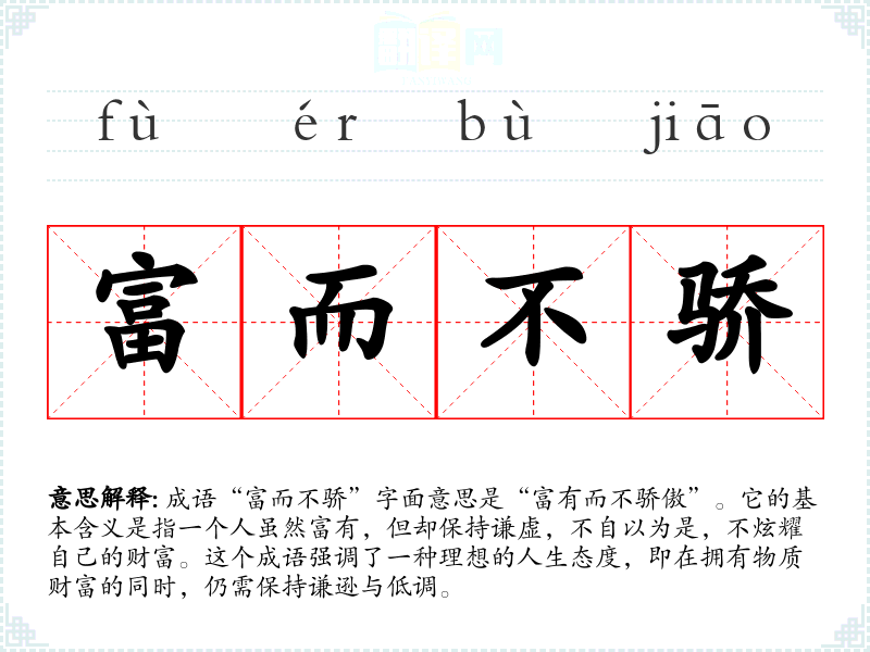 成语“富而不骄”字面意思是“富有而不骄傲”。它的基本含义是指一个人虽然富有,但却保持谦虚,不自以为是,不炫耀自己的财富。这个成语强调了一种理想的人生态度,即在拥有物质财富的同时,仍需保持谦逊与低调。