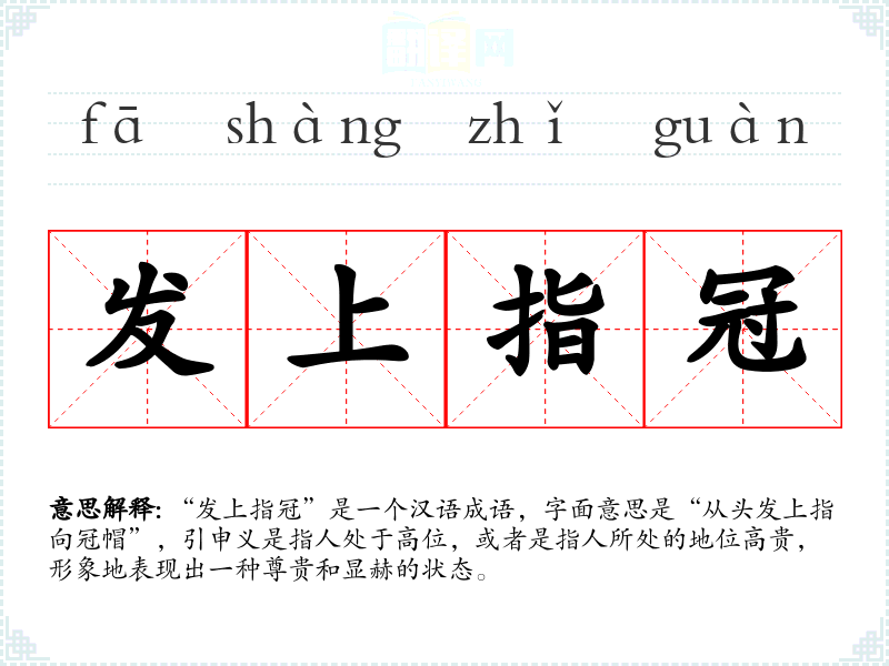 - 文学作品:描写人物地位时,可以用“发上指冠”来形容角色的显赫与尊贵。