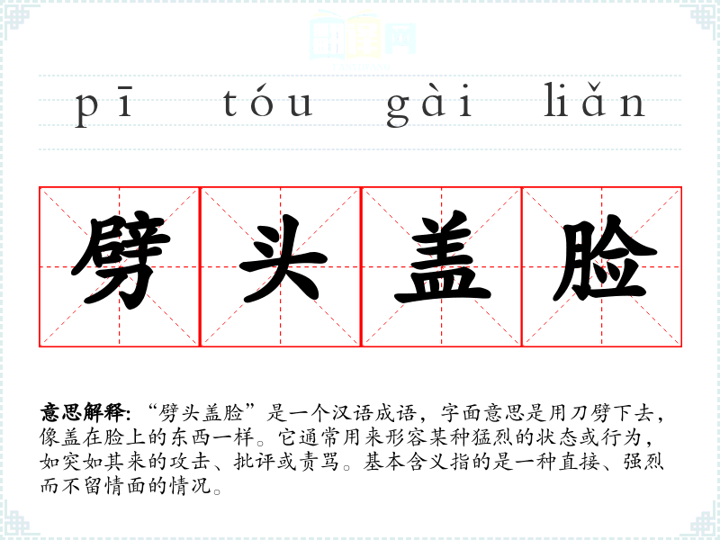 | 劈头盖脑 | 劈:正对着,冲着;盖:压。正对着头和脸盖下来。形容来势很猛,不容躲避。 |