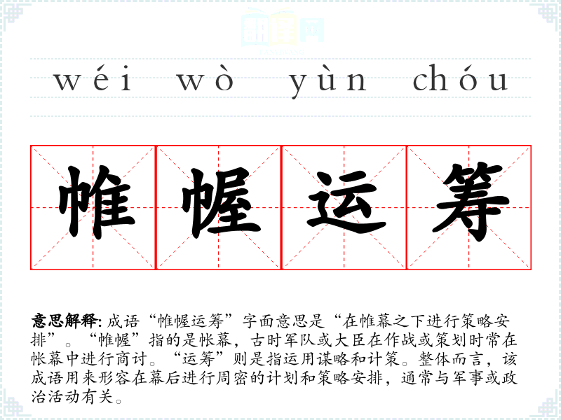 成语“帷幄运筹”字面意思是“在帷幕之下进行策略安排”。“帷幄”指的是帐幕,古时军队或大臣在作战或策划时常在帐幕中进行商讨。“运筹”则是指运用谋略和计策。整体而言,该成语用来形容在幕后进行周密的计划和策略安排,通常与军事或政治活动有关。