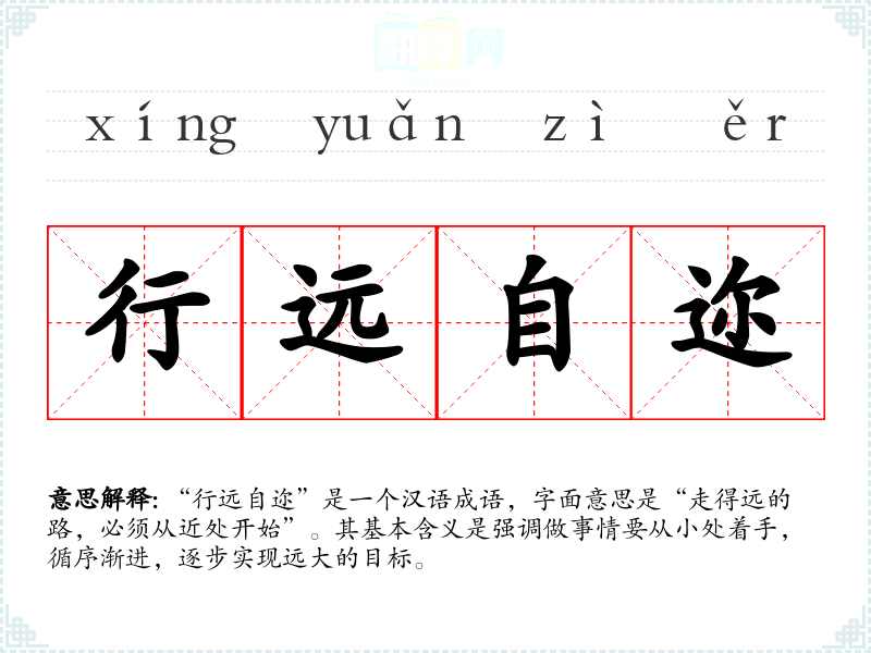 “行远自迩”是一个汉语成语,字面意思是“走得远的路,必须从近处开始”。其基本含义是强调做事情要从小处着手,循序渐进,逐步实现远大的目标。