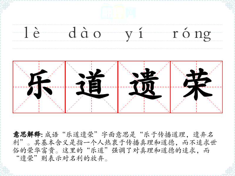 成语“乐道遗荣”字面意思是“乐于传播道理,遗弃名利”。其基本含义是指一个人热衷于传播真理和道德,而不追求世俗的荣华富贵。这里的“乐道”强调了对真理和道德的追求,而“遗荣”则表示对名利的放弃。