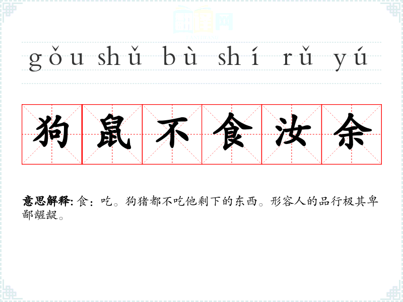 食:吃。狗猪都不吃他剩下的东西。形容人的品行极其卑鄙龌龊。 |
