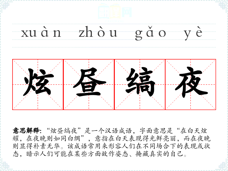 “炫昼缟夜”并没有明确的历史典故或文学出处,可能是后人创造的成语,结合了“炫耀”和“缟白”的字面意义,反映出一种对比和矛盾的状态。成语的构造中,"炫"与"缟"之间的对比,揭示了人们表面与内在的不一致。