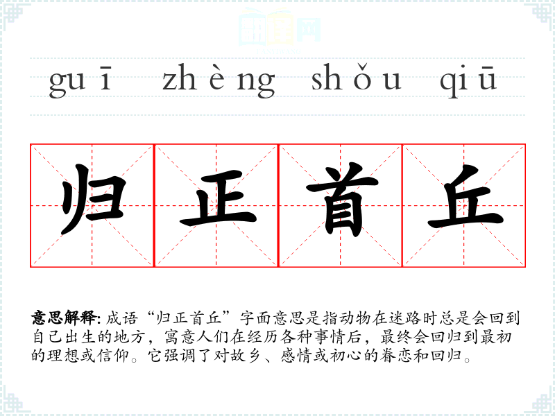 成语“归正首丘”字面意思是指动物在迷路时总是会回到自己出生的地方,寓意人们在经历各种事情后,最终会回归到最初的理想或信仰。它强调了对故乡、感情或初心的眷恋和回归。