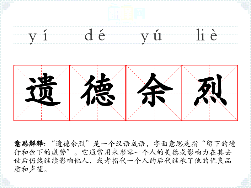 “遗德余烈”是一个汉语成语,字面意思是指“留下的德行和余下的威势”。它通常用来形容一个人的美德或影响力在其去世后仍然继续影响他人,或者指代一个人的后代继承了他的优良品质和声望。