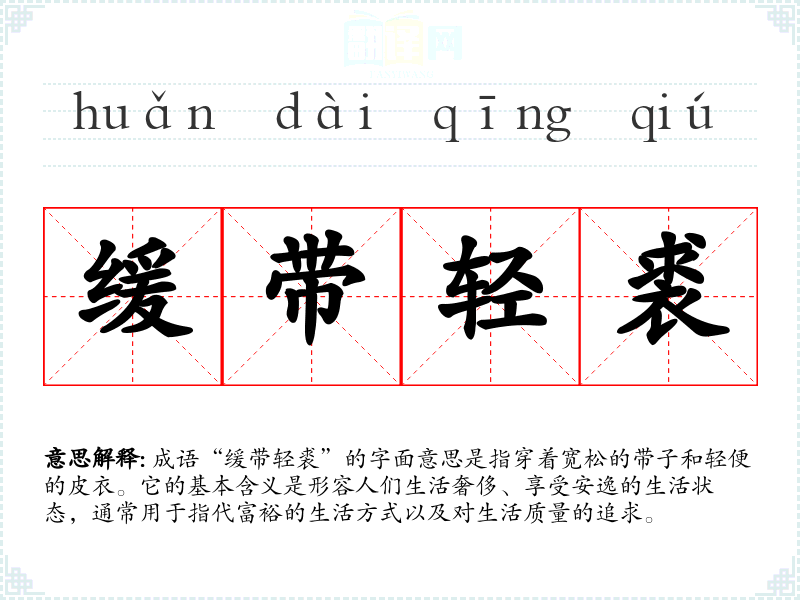 成语“缓带轻裘”的字面意思是指穿着宽松的带子和轻便的皮衣。它的基本含义是形容人们生活奢侈、享受安逸的生活状态,通常用于指代富裕的生活方式以及对生活质量的追求。