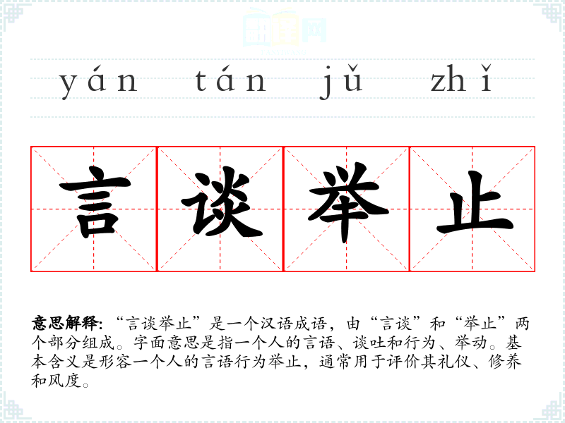 “言谈举止”是一个汉语成语,由“言谈”和“举止”两个部分组成。字面意思是指一个人的言语、谈吐和行为、举动。基本含义是形容一个人的言语行为举止,通常用于评价其礼仪、修养和风度。