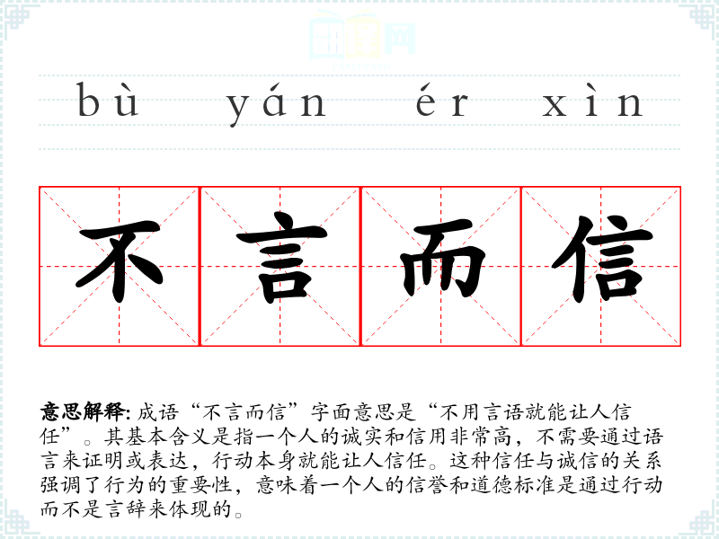 “不言而信”出自《论语·颜渊》,原文是“君子以文德,士以言信。”该成语强调了君子应以德行来赢得尊重和信任,而不仅仅依靠口头承诺。它反映了**古代儒家思想中对诚信与道德的重视。