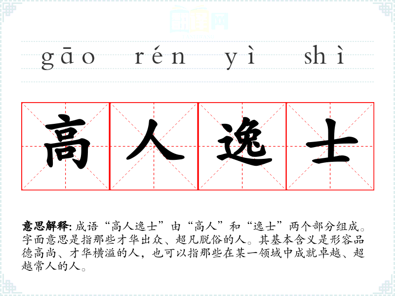 成语“高人逸士”由“高人”和“逸士”两个部分组成。字面意思是指那些才华出众、超凡脱俗的人。其基本含义是形容品德高尚、才华横溢的人,也可以指那些在某一领域中成就卓越、超越常人的人。