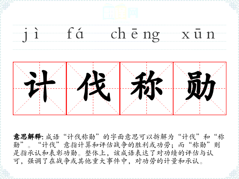“计伐称勋”并没有明确的历史典故或著作出处,但其意蕴可以追溯到古代对军事将领和英雄的评价。在**历史上,许多朝代对将领的功绩会进行评估,以决定他们的封赏和地位。这种文化背景使得“计伐称勋”成为了对功劳认可的一种表达。