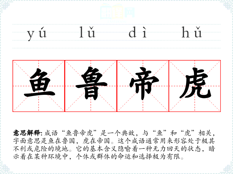 成语“鱼鲁帝虎”是一个典故,与“鱼”和“虎”相关,字面意思是鱼在鲁国,虎在帝国。这个成语通常用来形容处于极其不利或危险的境地。它的基本含义隐喻着一种无力回天的状态,暗示着在某种环境中,个体或群体的命运和选择极为有限。