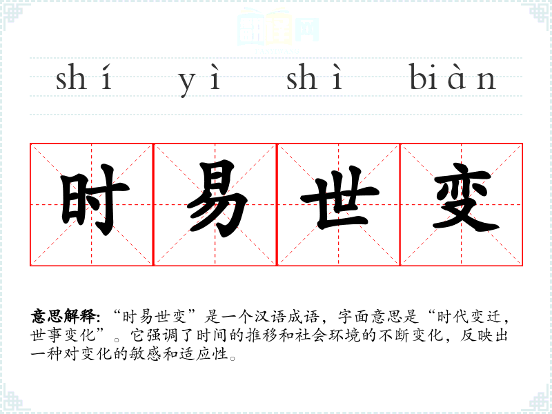 “时易世变”是一个汉语成语,字面意思是“时代变迁,世事变化”。它强调了时间的推移和社会环境的不断变化,反映出一种对变化的敏感和适应性。