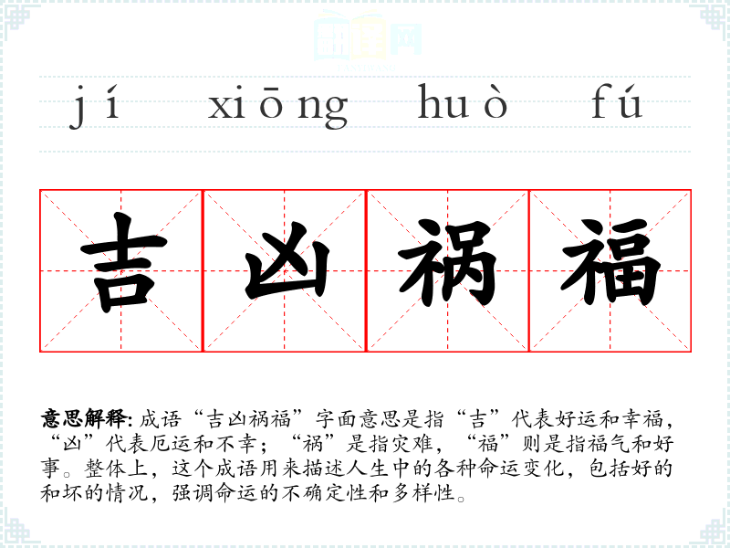 成语“吉凶祸福”字面意思是指“吉”代表好运和幸福,“凶”代表厄运和不幸;“祸”是指灾难,“福”则是指福气和好事。整体上,这个成语用来描述人生中的各种命运变化,包括好的和坏的情况,强调命运的不确定性和多样性。