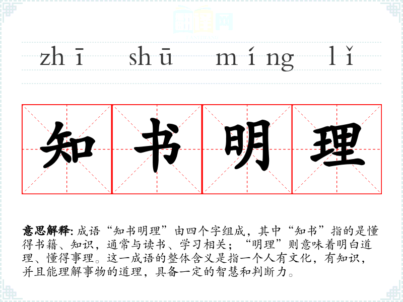 - 日常对话:可以用来赞美一个有知识、懂道理的人,例如,“你真是个知书明理的人。”